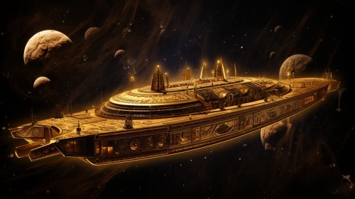 Ancient Egyptian spaceship, Ancient egyptian culture, ancient egyptian architectural design, sandy gold color, hieroglyph insignia of manufacurer, nebula backdrop, highly detailed, 64k, --ar 16:9