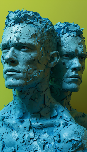 Generate two digital art pieces in portrait orientation, featuring two non-identical busts made from bright blue plasticine clay. The busts should depict men with a natural, average physique, emphasizing a more realistic, non-idealized form. Special attention should be given to creating a natural-looking chest, with realistic fat distribution and imperfections. The texture of the busts should be highly realistic, highlighting the tactile quality of the clay. The sculptures are set against a contrasting lime green background, with a top-down perspective that underscores their natural, authentic aesthetic. The image should capture the essence of everyday realism in the male form. --ar 4:7 --v 6.0