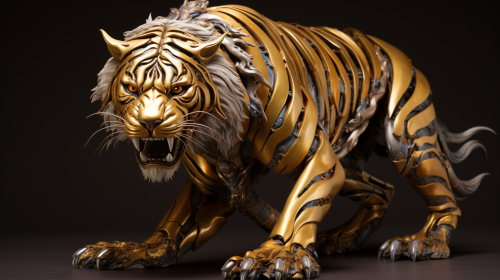 a gold statue of a TIGER with her eyes wide open FULL body, in the style of realistic and hyper-detailed renderings, sculptures made with gold color thin wire, captures raw emotions, flowing brushwork, chromepunk, photo-realistic techniques --ar 16:9 --v 5.2