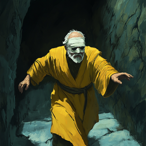A mobile game thumbnail, an old man in a yellow robe, white bandage covering his eyes, walking through a dark cavern, one arm stretched out, digital painted, simplistic, fantasy colorful style, rules of third composition, dramatic lighting, mystery colors, soft lighting, hd, bold strokes, collectible card illustration