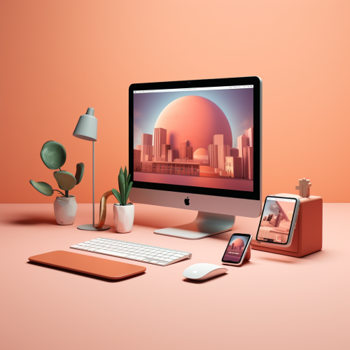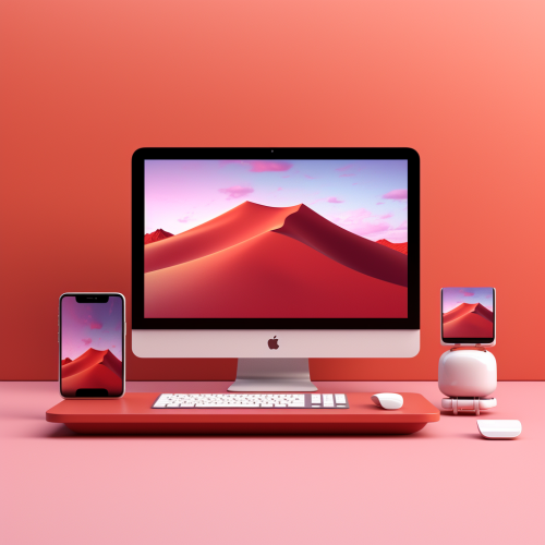 Realistic photo of a computer and mobile devise collection, imac iphone ipad, close up image, screen in the middle, red and pink background colours, shadows, minimalistic style