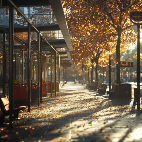 realistic photography like , side walk , bus station , day time , front view , light from right , close up , fall , bus station from front , epmty seats ,