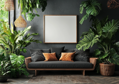 real photo. there are the dark sofa and lots of plants with empty framed board on the wall. board is white color i . wall is gray --ar 7:5 --q 2 --s 750