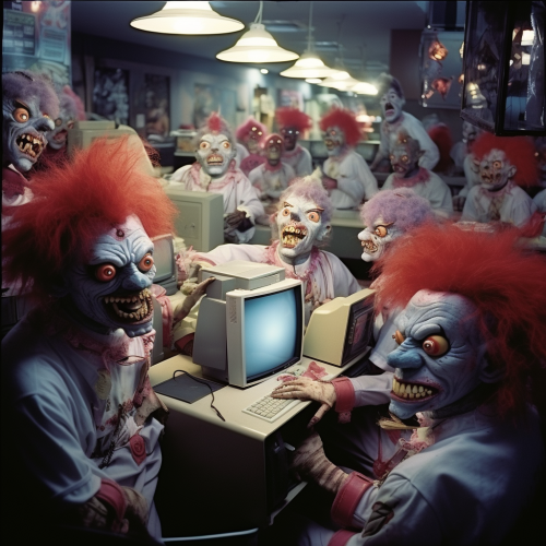 a charcoal drawing of a childs red jack in a box with a turn handle with a spring coming out with a cctv camera on the end. on a plain white paper background