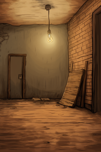 A completely dark black empty space. In the far there is a slim light beam going straight down the middle illuminating the silhouette of a person