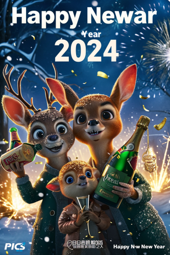 Deer family (father, mother and 3 children) (one deer is made out of diamond, and the other deer is made out of gold) in winter coats ceremoniously opening a big bottle of champagne to celebrate New Years Eve 2024 + perfect photo + very funny + Taken with a Sony camera + big bulging eyes + fireworks in the background + funny + In the sky the inscription "Happy New Year 2024 !" + perfect realistic photo --ar 2:3 --v 6.0