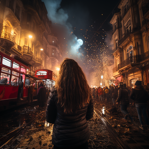 new year’s celebration in Lisbon, night, colorful, happy vibes --s 750