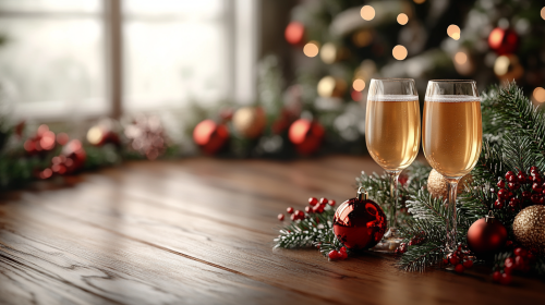 table with glasses of champagne and Christmas decorations with empty space from the left side photorealistic --ar 16:9 --style raw --stylize 350 --v 6.1