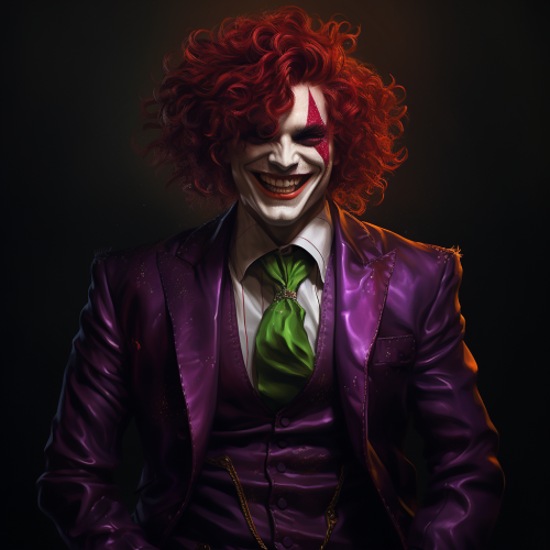 <hyper realism>, clown, desperation, big dented maniac smile, dark red colored fluffy curly messy hair, green glowing eyes, at his limit, elegant dark purple colored suit, detailed, 3D, man in his 20's