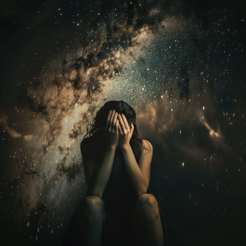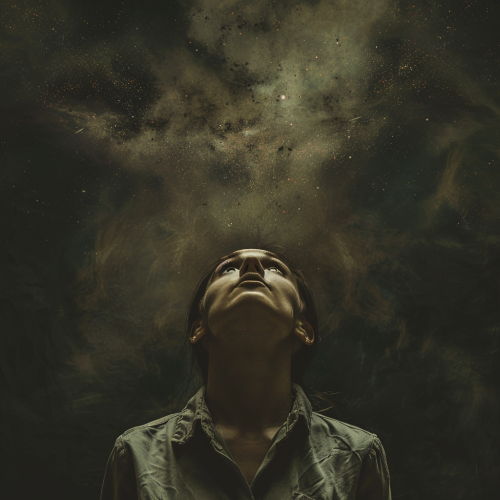 Desperate 50yr woman in bed with hand in her hairs, she can't sleep for days, she is desperate, beside her are sleeping pills on the pillow, her eyes are tired, is desperate, A realistic photo with an overhead view,