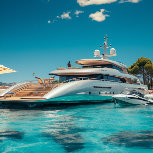 many people on the yacht in the mediterrainean sea. bird eye view. smart casual. champagne. picture from the helicopter.elegant, hyper realistic, super detailed, dynamic poses. photorealistic. 32k. --ar 16:9 --s 750 --style raw