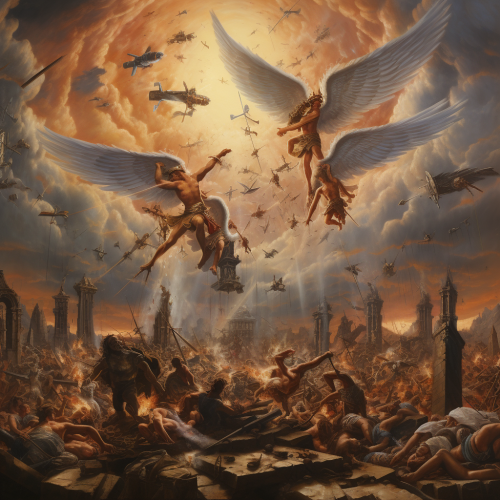 A celestial battle between angels and demons. ar 3:2 niji 6