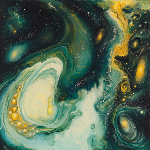 Abstract artwork depicting celestial harmony with swirling galaxies