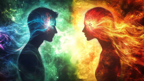 A male figure facing a female figure. Show the energy centers in both figures. Draw the flowing energy at the 3rd chakra from the woman to the man stealing her energy. --ar 16:9