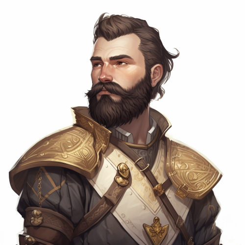 dnd character, leather armor, gold trim, bearded, buzzed hair, scabbard, white background, portrait --v 5.0