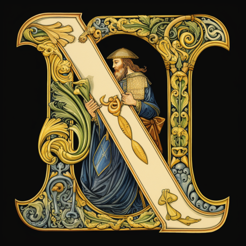 close-up of a page from an illuminated manuscript or a document styled in that fashion. It features a large, ornate initial letter "L" decorated with intricate designs including scrollwork and what looks like gold leaf accents. The colors primarily used in the decoration are blue, red, and green, with gold outlining the letter and its embellishments. The background of the paper has an aged look, giving it a parchment-like appearance. Below the initial, there is some text in a font that resembles historical script, though the content of the text is not entirely visible in the image. This style of decoration is characteristic of medieval manuscripts, where the first letter of an important section was often elaborately illustrated.