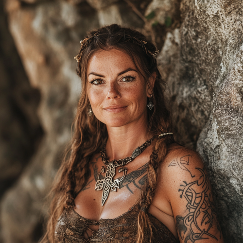 40-year old female Celtic warrior with tattoos in front of a rough stone wall, she has brown eyes and light brown hair, Celtic jewelry, and image is from waist up