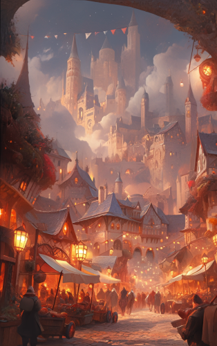 ( Masterpiece) Landscape, OIL painting of the best quality, highly detailed, dynamic lights and shadows, Castle market in a festive atmosphere, epic fantasy, inspired by the work of Frank Frazetta --ar 10:16 --niji 5