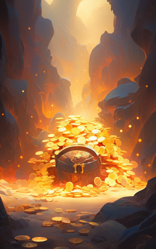 ( Masterpiece) 3D oil painting of the best quality, highly detailed, dynamic lights and shadows, mountain of gold coins in a chest epic fantasy, inspired by the work of Frank Frazetta --ar 10:16 --niji 5