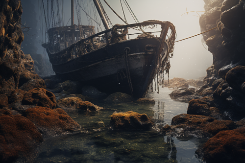 Despite the risks, we couldn't ignore a call for help. We navigated through narrow channels, the ship's hull creaking ominously as the acidic waters lapped against it. Finally, we found the source: a small research vessel, its hull severely damaged by the acid. --ar 3:2 --v 5.2