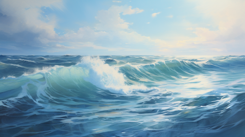 Open ocean scene in the central Pacific on January 16, 1988, depicting a vast expanse of water under clear skies. The foreground shows gentle waves rolling endlessly, with a research vessel in the distance conducting routine observations. In the background, the horizon stretches uninterrupted, emphasizing the remote and boundless nature of the Pacific Ocean. The lighting is bright and expansive, capturing the tranquil yet mysterious essence of the sea. --ar 16:9 --v 6.0 --style raw