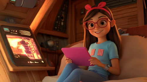 Inside a cozy wooden treehouse-turned-spaceship, Bryanna, a 8-year-old girl with straight brown hair, a band hairstyle, red and white squares headband, pink glasses, and a slightly chubby build, is sitting comfortably on a wooden bench. She is holding a a pink tablet with a big grin on her face. Bryanna is wearing a light blue t-shirt, light blue jeans, and white sneakers. Her bright brown eyes are filled with excitement as she reflects on the space adventure they've just had. The background includes the simple wooden walls of the treehouse, with a glowing metallic command console nearby. The style is 3D render --ar 16:9