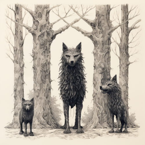 a drawing of the mythical and multi-headed animal cerberus, he stands upright and is a gatekeeper, in the style of edward gorey, standing in a clearing of a forest