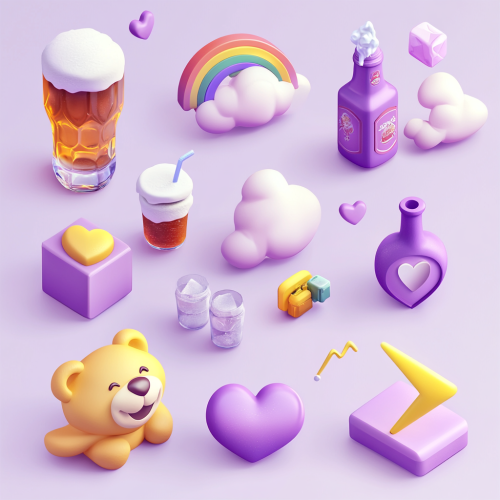 Cute 3d emojis, isometric view, lip, Rainbow on the clouds, a teddy bear holding a heart, two glasses of beer, a bottle of soda and three ice cubes surrounding it, a heart above the heart gesture, and a small lightning bolt near the YA gesture, render in the style of vector illustration,the main color is trendy purple, highlighting each icon, designed in a style that is suitable for use on social media platforms, such as Instagram or live broadcast room gift style, on a white background— stylize 200