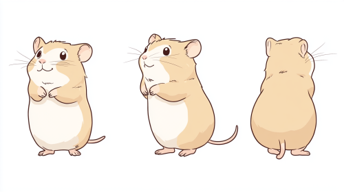 A simple, cute illustration of a hamster with bold, clear outlines, showing four distinct and perfectly aligned views: front, side, and back. The front view shows the hamster facing directly forward, with both eyes, cheeks, and paws visible, standing upright with a friendly expression. The side view shows the hamster fully in profile, facing directly left, with its entire body from nose to tail visible, including its legs and fluffy fur. The back view shows the hamster's back fully, with its tail centered and both ears visible from behind. The illustration style is minimalistic, with soft pastel colors (like light browns, creams, and soft pinks) to create a gentle, cartoon-like appearance. The background is plain white to highlight the hamster's simple, cute features. --ar 16:9 --v 6.1