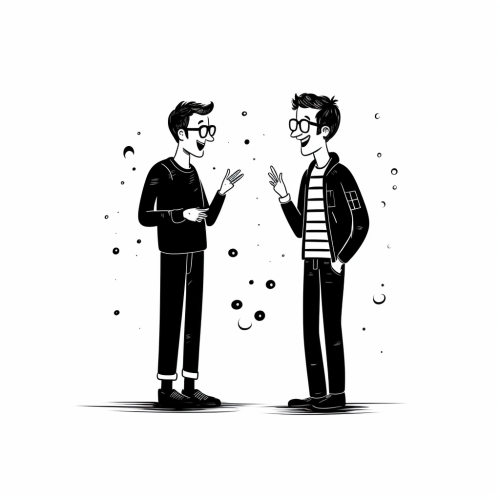 two nerd designers having a friendly amusing chat, minimalist flat black and white illustration, pure white background, simple lines, high contrast