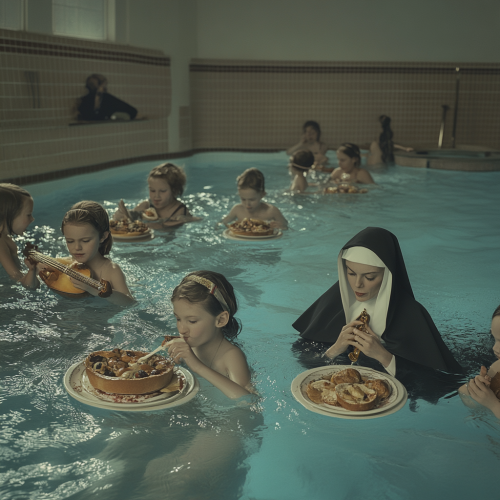 a realistic photo of group of children and a catholic nun swimming at the sport-sized swimming pool and simulatenously eating dinner and playing musical instruments.