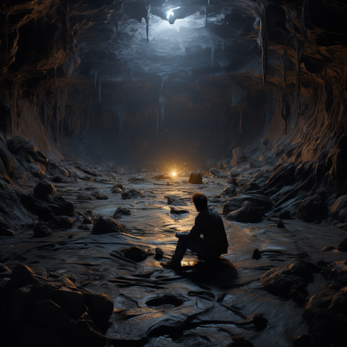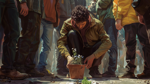 photorealistic image of A man crouching down looking at an empty flower pot, the man is surrounded by people with their backs turned to him. --ar 16:9 --v 6.0