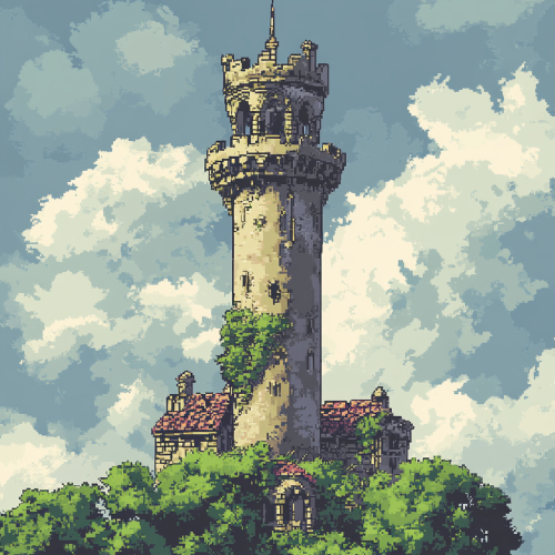 create a logo for the visual identity of a pixel art game in a medieval cartoon theme with a huge tower seen from the bottom up to the observer's point of view