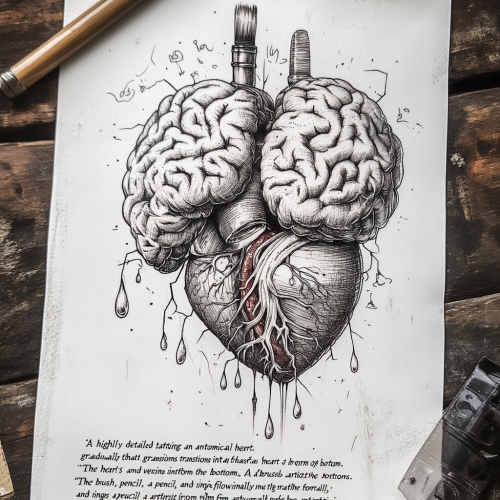 "A highly detailed tattoo design featuring an anatomical heart that gradually transitions into the form of a brain at the bottom. The heart's aorta and veins transform into artistic tools: a brush, a pencil, and ink drops flowing naturally from the arteries. The overall style is intricate and symbolic, blending elements of realism and surrealism with fine linework and shading. The heart and brain represent the connection between emotion and creativity, with the tools symbolizing artistic expression."