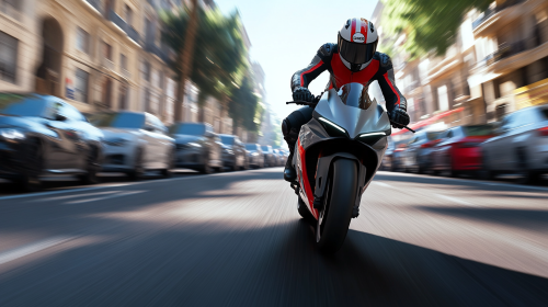Ultra-wide shot of a helmeted motorcyclist racing down the road between rows of cars, intense motion blur capturing the speed, rendered in realistic 3D, captured with a Canon EOS R5, RF 24-105mm f/4L IS USM, aperture f/4, ISO 800, shutter speed 1/500 sec for dynamic clarity, --ar 16:9 --v 6.1