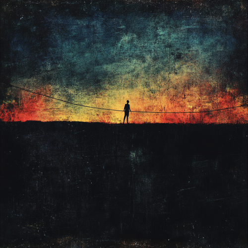 An award winning album cover. Cinematic. A lone figure walking on a tightrope high above the ground, set against a dramatic sunset or dark, starry night sky. Below them is a vast, dark abyss, symbolizing emotional depth and pressure. The person appears uncertain and vulnerable, teetering between balance and falling. The scene is both intense and fragile, representing the tension between honesty and kindness, with a cinematic, moody atmosphere.