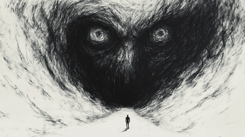 A rough, chaotic pencil sketch depicting a small figure standing at the edge of a path that leads into a vast, dark abyss. From within the abyss, a colossal, indistinct entity looms, with only its eerie, ominous eyes visible as it peers out at the tiny figure. The figure stands frozen in fear, dwarfed by the sheer size and presence of the unknown entity. The lines are jagged and rough, emphasizing the terrifying scale and the unsettling atmosphere of the scene. The abyss is drawn with swirling, chaotic strokes, adding depth and darkness, while the entity’s gaze is both captivating and terrifying. The overall atmosphere is filled with dread and suspense, capturing the overwhelming fear of facing the unknown. --c 8 --ar 16:9 --v 6.1