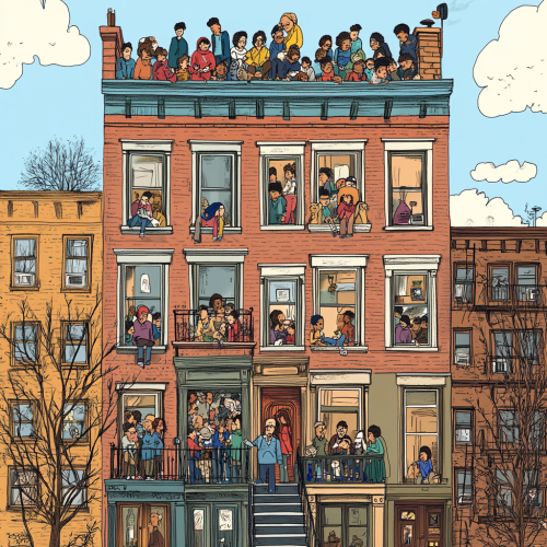 an modern illustration of a brooklyn brownstone apartment, front door is open and we can see there's thousands of diverse people inside, it's totally over crowded, their legs come out the windows, heads pop out of the chimney, people from all walks of life and occupations appear inside, on the roof, and coming out of the windows, they face the viewer with love in their eyes, extremely chaotic, in the style of an illustrated movie poster