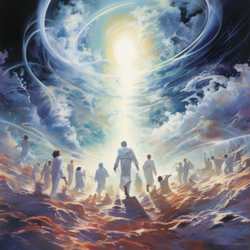 Alex Ross and Bill Sienkiewicz illustration painting of a zoomed out painting of characters in all white floating in a wave of people towards the sky. Nature and bushes at a dynamic zoomed angle. Mystical pops of upbeat designs and smoke. Colored pencil pastel illustration. Glowing dark dynamic white colors and character designs. Monochromatic with little subtle color --v 5.2