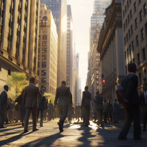 : a photorealistic depiction of professional businessmen gathering on Wall Street, captured in 8k resolution and an ultra-wide 16:9 aspect ratio. The scene boasts epic composition, utilizing Unreal Engine for cinematic quality and color grading that emphasizes hyper-detailed, beautifully color-coded suits and intricate cityscape details. Depth of field is carefully managed to draw the viewer’s attention, enhanced by ultra-wide angle optics and sophisticated lighting techniques including halfrear, backlight, and natural lighting to achieve a moody, cinematic atmosphere. The image should also incorporate advanced CGI techniques such as ray tracing for reflections and global illumination, anti-aliasing for smooth edges, and post-production effects like chromatic aberration and tone mapping to create an insanely detailed and intricate visual feast that captures the dynamic essence of a professional gathering on Wall Street, all rendered in super-resolution for ultimate clarity and depth --v 6.0