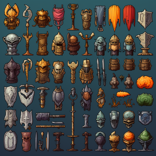 collection of 2d, pixel art, armor pieces, character sheet style, 16 bit