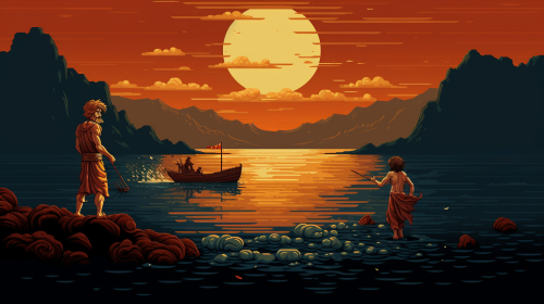 greek mythology in the style of classic video game pixel art style, --ar 16:9