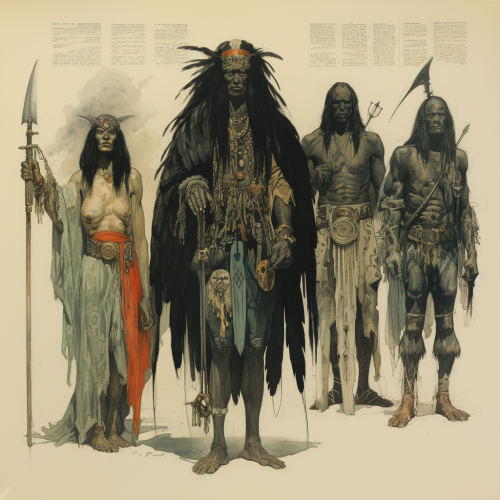 characters design sheet by frazetta & DRuillet, une divinité féminine zoomorphe aux ailes de corbeau. Divinité de la mort et de la guerre, elements of culture of the ural steppes