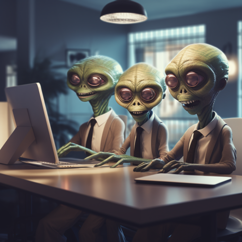 three friendly aliens sitting in an office, they are arguing about how to design the website for their company.
