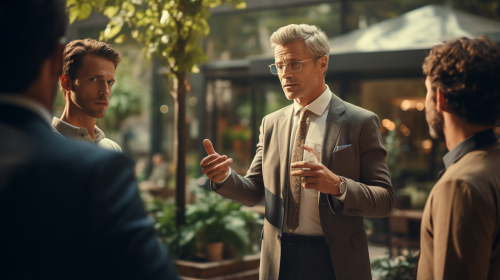 Charismatic Confident businessman explaining to this workmates outdoor photorealistic --ar 16:9 --s 250