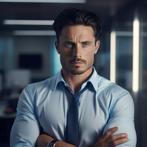 gorgeous handsome good looking businessman in modern office. Shirt buttons undone. Shirt sleeves rolled up. Strong. Muscular. Piercing blue eyes. Model. Brooding. Hyper realistic. 8k resolution. Photographic quality. Medium colour palette