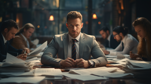charistmatic businessman talking to his confused workmates in the office photorealistic --ar 16:9 --s 250