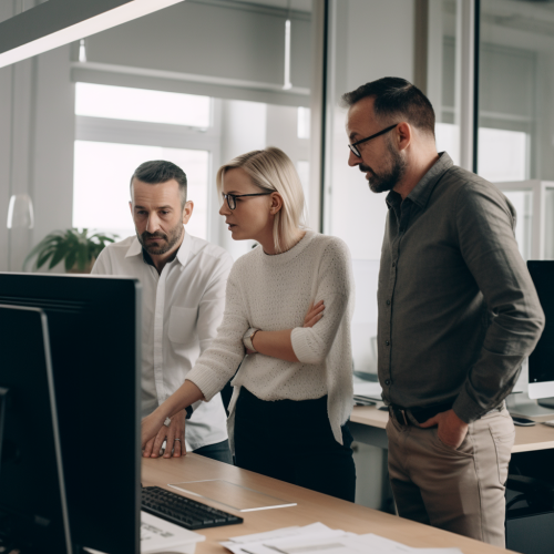 accomplished businessman talking to his workmate standing in the office photorealistic --ar 16:9 --s 250