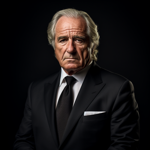 Bernard Madoff, in the style of social media portraiture, photobashing, classic portraiture, gritty hollywood glamour, ultra hd, pont-aven school, political satire, black background, 4k, black suit, zoom on face, confident face