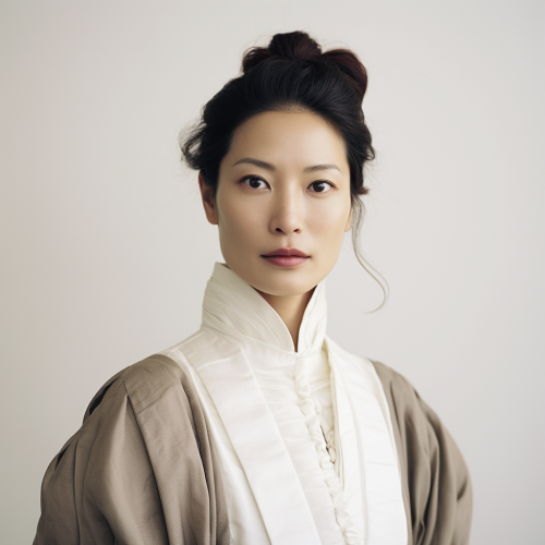 The full - long shot half - body photography, isolating from the completely white bright background, of a beautiful 40 - year old Asian - Japanese female, hair up, mysterious mixed vibe between Simplicity Minimalistic, Renaissance knight and Japan 80s City Pop, asymmetry balancing posing, stylistically inspired by Agnolo Bronzino, Johannes Vermeer, Gustav Klimt, Caspar David, Alex Katz, and Gustave Courbet. Real Texture, rim lighting, Real Skin, Rim Light, Warm Light, DOF, Sharp Focus, ultra - realistic, using Canon EOS6 23mm F/ 1. 8
